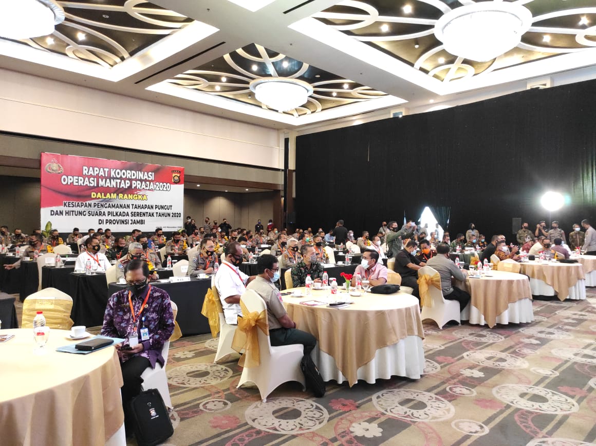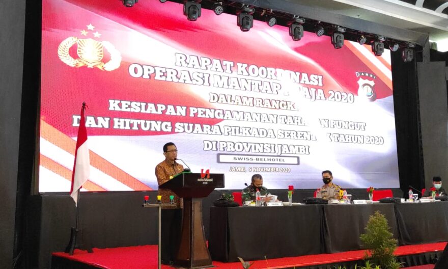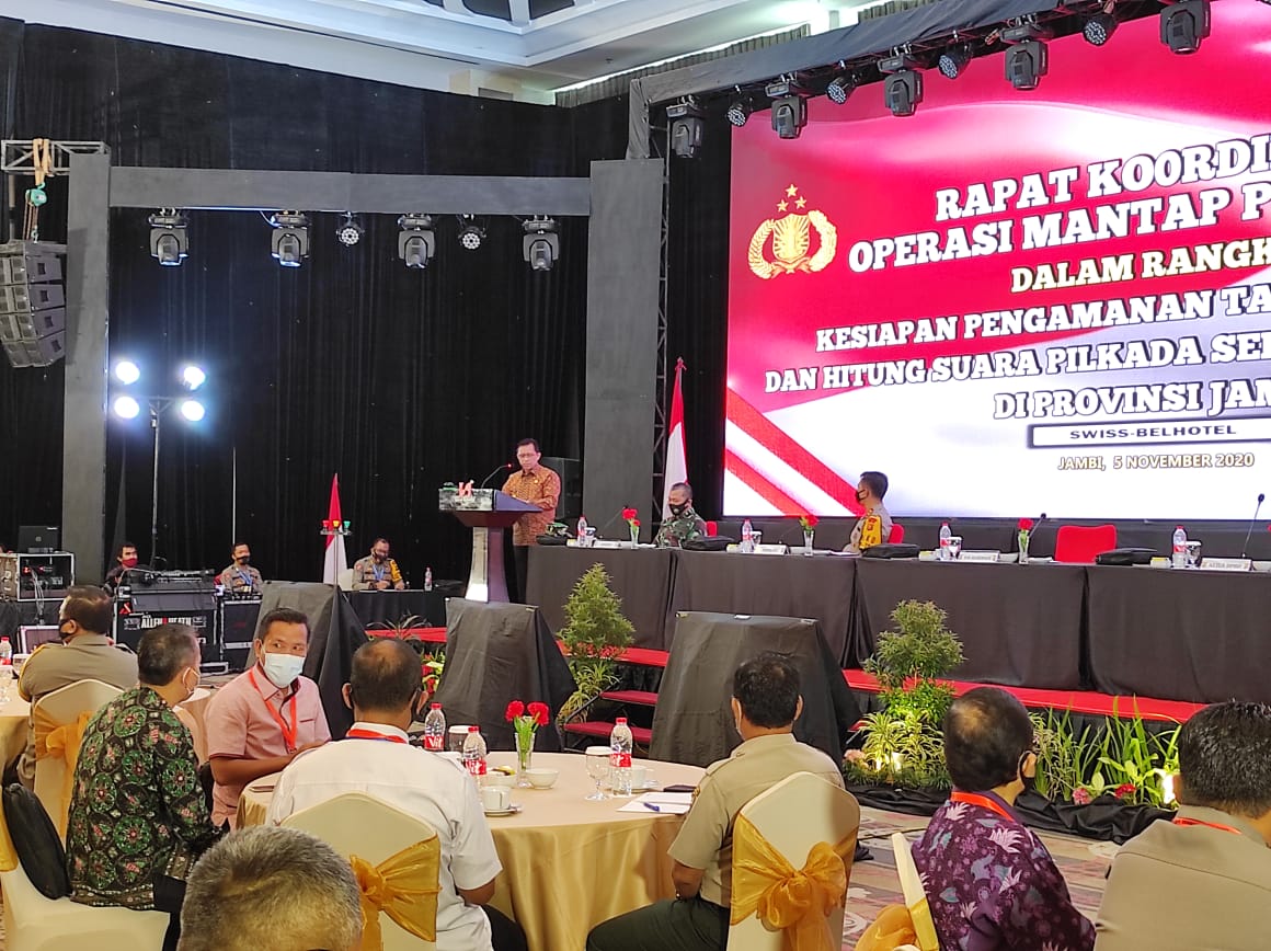 harianmetropolitan.co.id, Jambi- Rapat Koordinasi Operasi Mantap Praja Dalam Rangka Kesiapan Pengamanan Tahapan Pungut dan Hitung Suara Pilkada Serentak Tahun 2020 di Provinsi Jambi berlangsung di Swiss-Bellhotel Jambi, Kamis (5/11/20).