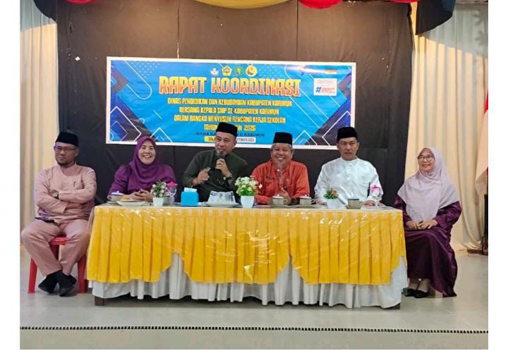 KARIMUN, harianmetropolitan.co.id- Dinas Pendidikan dan Kebudayaan (Disdikbud) Kabupaten Karimun menggelar Rapat Koordinasi bersama Kepala SMP se-Kabupaten Karimun dalam rangka penyusunan Rencana Kerja Sekolah (RKS) Tahun Anggaran 2026. Kegiatan tersebut berlangsung khidmat dan penuh semangat kolaborasi, dengan menghadirkan narasumber dari BPKAD dan Inspektorat Daerah, Kamis 25 September 2025.