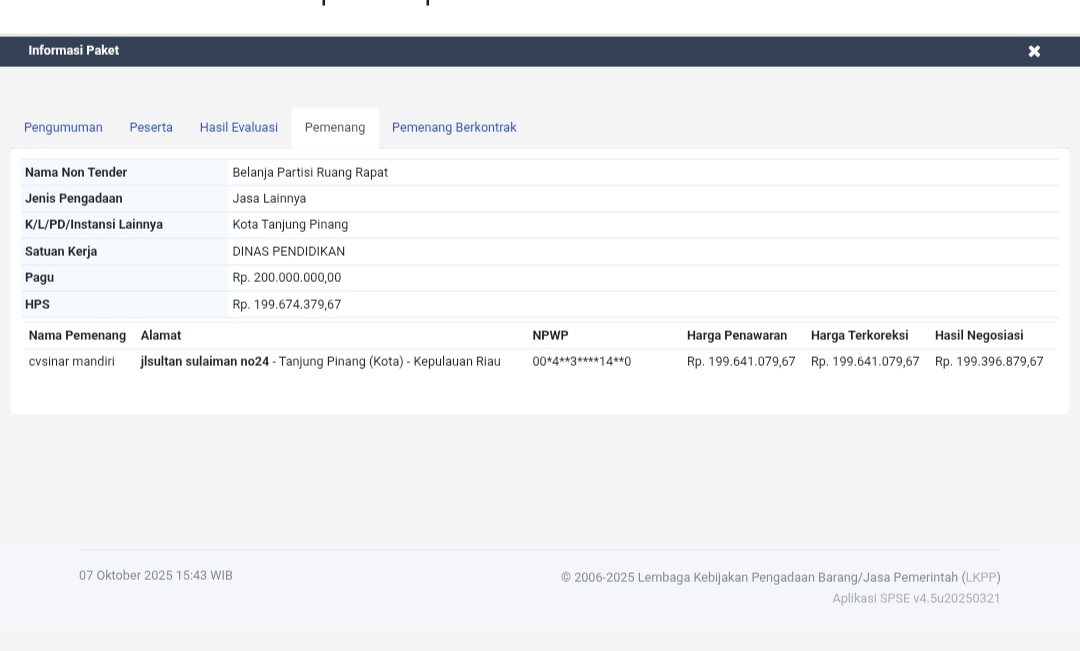 TANJUNGPINANG, harianmetropolitan.co.id – Skandal dugaan pelanggaran serius menyelimuti pelaksanaan proyek pengadaan langsung Belanja Partisi Ruang Rapat di Dinas Pendidikan Kota Tanjungpinang tahun anggaran 2025.