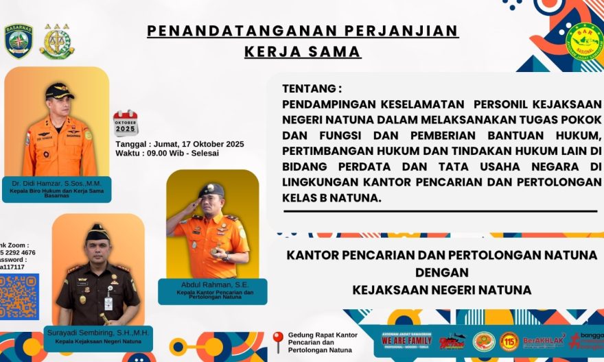 Kegiatan tersebut dijadwalkan berlangsung pada Jumat, 17 Oktober 2025, di kantor Basarnas Natuna. Kerja sama ini bertujuan untuk memperkuat sistem pendampingan hukum serta meningkatkan aspek keselamatan bagi personel dalam menjalankan tugas pokok dan fungsi di wilayah kepulauan Natuna.