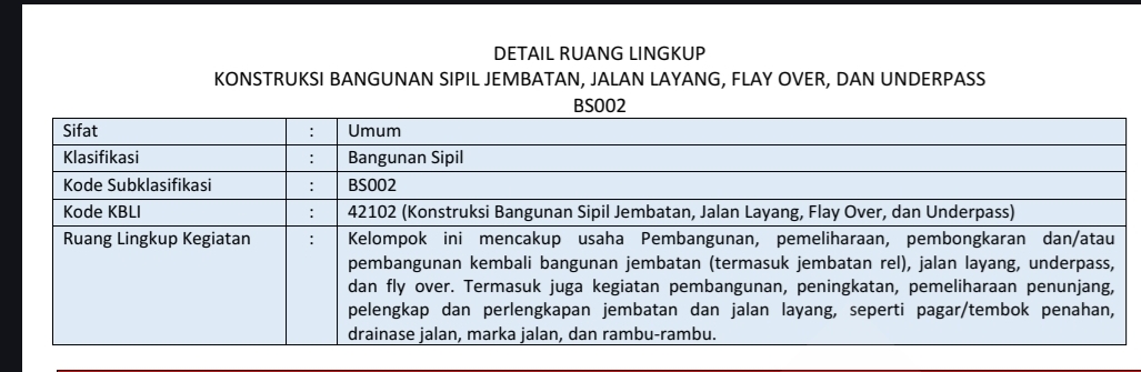 Berdasarkan penelusuran dokumen perizinan, perusahaan pelaksana tidak memiliki subklasifikasi BS002, yakni bidang konstruksi bangunan sipil jembatan, jalan layang (flyover), dan underpass dengan KBLI 42102 yang menjadi ruang lingkup pekerjaan pembangunan pelantar.