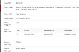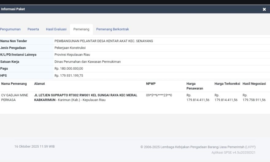 Kepri, harianmetropolitan.co.id – Pekerjaan Pembangunan Pelantar Desa Kentar Akat Kecamatan Senayang senilai Rp179,7 juta yang dibiayai APBD Provinsi Kepulauan Riau Tahun 2025, menuai sorotan. Proyek dengan metode pengadaan langsung ini dilaksanakan oleh CV Gadjah Mine Perkasa, dengan nilai kontrak Rp179.758.911, di bawah kewenangan Dinas Perumahan dan Kawasan Permukiman (Perkim) Provinsi Kepri.