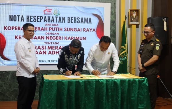 KARIMUN, harianmetropolitan.co.id- Ketua Koperasi Merah Putih (KMP) Kelurahan Sungai Raya, Jais, menandatangani nota kesepakatan bersama dengan Kejaksaan Negeri (Kejari) Karimun, yang diwakili oleh Kepala Kejari Karimun, Dr. Denny Wicaksono, di Aula Kejaksaan Negeri Karimun, Rabu 22 Oktober 2025.