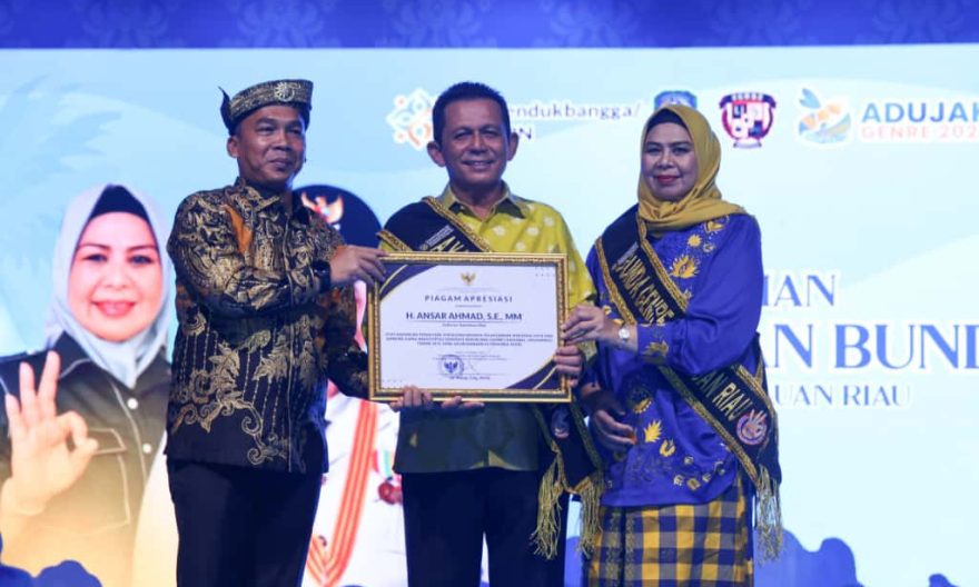 Pada kesempatan yang sama, Menteri Wihaji turut menyematkan selempang “Ayah dan Bunda GenRe Kepulauan Riau” kepada Gubernur Ansar Ahmad dan Hj. Dewi Kumalasari Ansar.