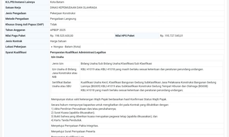 Sumber internal pengadaan mengungkapkan bahwa Dispora Batam mensyaratkan SBU BG009 – Bangunan Gedung Lainnya (KBLI 41019) atau BG008 – Konstruksi Gedung Tempat Hiburan dan Olahraga (KBLI 41018).