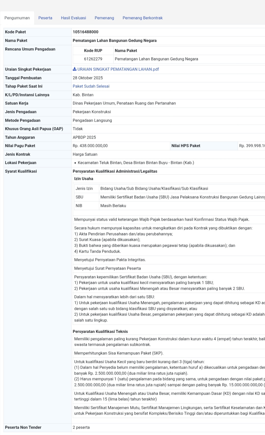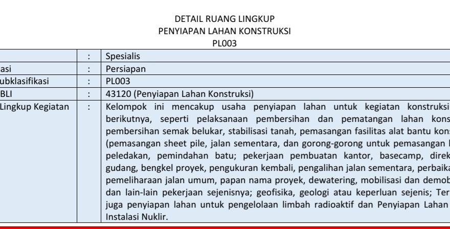 Paket pekerjaan dengan hasil negosiasi Rp 399.987.062,05 itu mempersyaratkan SBU BG009 – Bangunan Gedung Lainnya, bukan PL003 – Penyiapan Lahan Konstruksi, yang secara teknis merupakan subklasifikasi semestinya untuk kegiatan pematangan lahan.