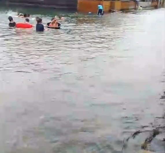 Namun, di tengah kondisi tersebut, sejumlah anak dan remaja justru memanfaatkan momen air pasang untuk berenang di genangan yang terbentuk di sekitar jalan. Suasana yang biasanya padat kendaraan berubah menjadi lokasi permainan air dadakan, pada Senin 8 Desember 2025.