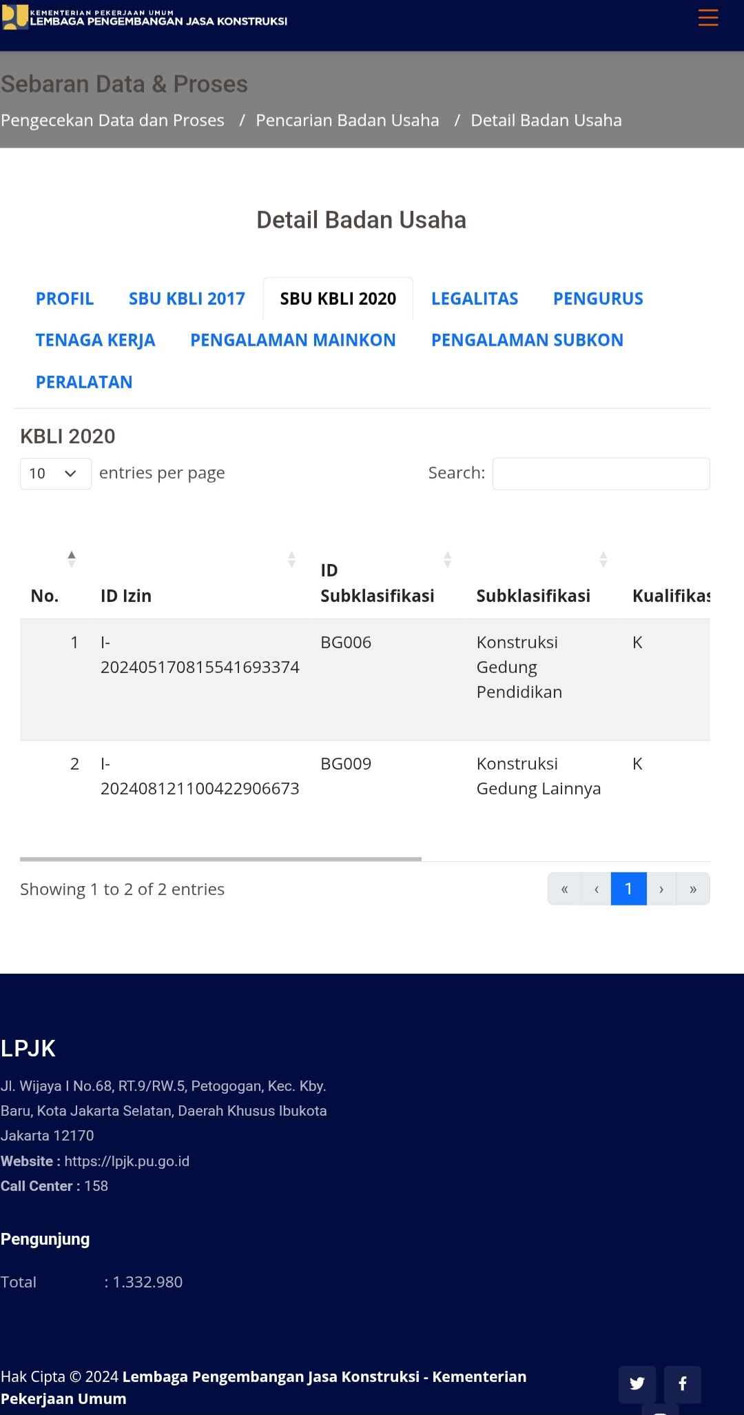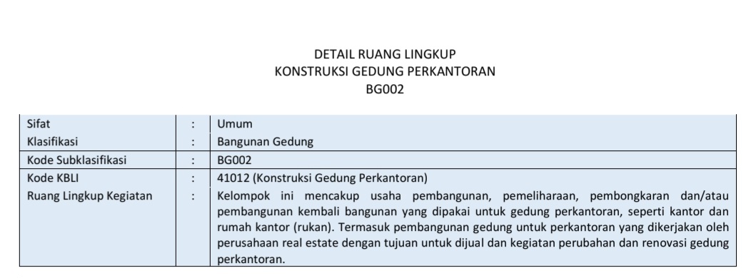 Menurut ketentuan UU No. 2/2017 serta ketentuan KBLI, paket rehabilitasi gedung masuk dalam klasifikasi BG002 (KBLI 41012), yakni ruang lingkup pekerjaan pembangunan dan pemeliharaan gedung perkantoran.