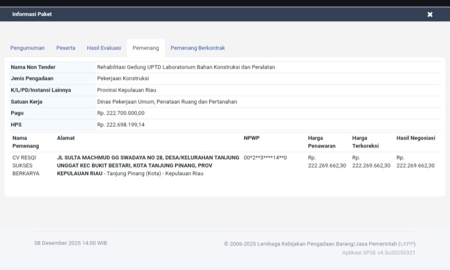 Tanjungpinang, harianmetropolitan.co.id – Dugaan praktik pengadaan bermasalah kembali menyeruak di lingkungan Dinas Pekerjaan Umum, Penataan Ruang dan Pertanahan (PUPR) Provinsi Kepulauan Riau. Paket Pengadaan Langsung Rehabilitasi Gedung UPTD Laboratorium Bahan Konstruksi dan Peralatan dengan HPS senilai Rp222.698.199,14 diduga dimenangkan oleh perusahaan yang tidak memiliki Sertifikat Badan Usaha (SBU) sesuai ketentuan hukum jasa konstruksi.