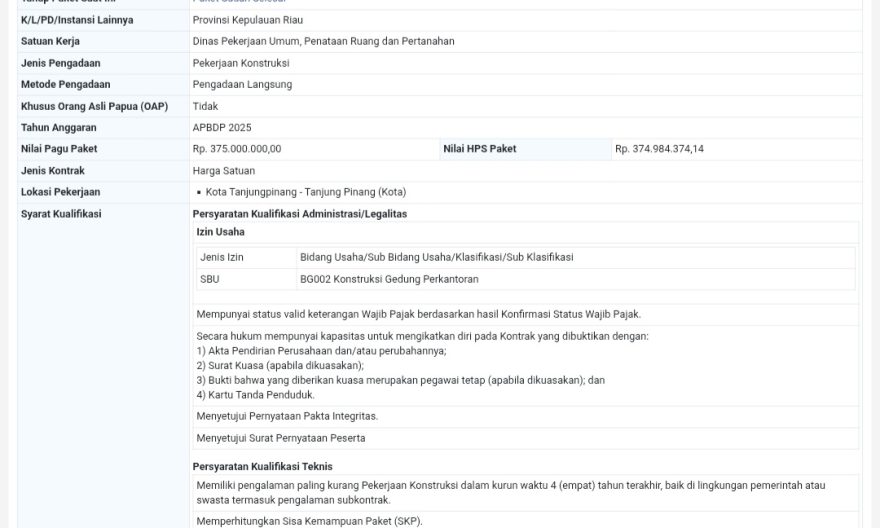 Tanjungpinang, harianmetropolitan.co.id – Ketentuan Undang-Undang Nomor 2 Tahun 2017 tentang Jasa Konstruksi dan Peraturan Pemerintah Nomor 5 Tahun 2021 kembali dipertanyakan penerapannya di lingkungan Pemerintah Provinsi Kepulauan Riau. Pasalnya, Dinas Pekerjaan Umum, Penataan Ruang dan Pertanahan (DPUPRP) Kepri diduga meloloskan paket pengadaan interior Gedung Ex Bintan Expo kepada CV Halifa Berkah Utama tanpa dukungan Sertifikat Badan Usaha (SBU) spesialis yang sesuai.